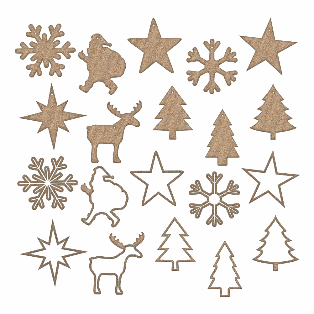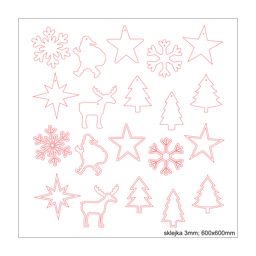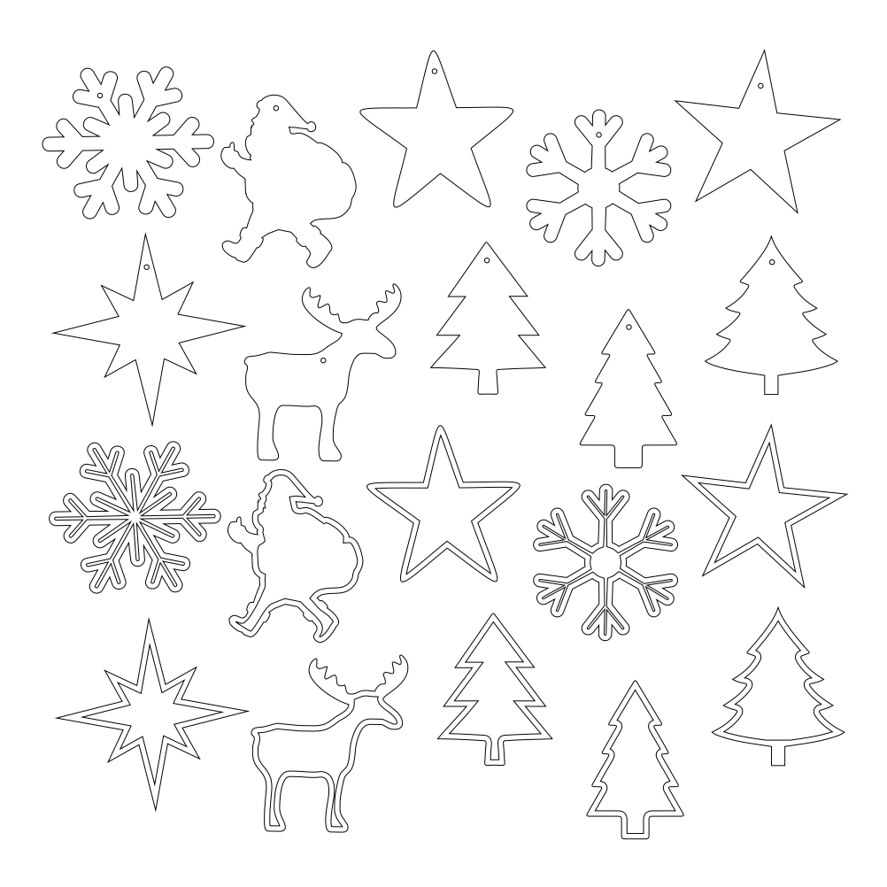 Plik wektorowy zawiera ozdoby świąteczne na Boże Narodzenie. 20 ozdób wytniesz np. ze sklejki. Sylwetka Świętego Mikołaja, płatek śniegu, gwiazdka, choinka, renifer, Mikołaj. Ozdoby po wycięciu możesz powiesić w pokoju, nadając mu wyjątkowy, świąteczny klimat. Ozdoby wycięte ze sklejki możesz dodatkowo pomalować lub zabarwić bejcą. Można je również w łatwy sposób personalizować, wykorzystaj je jako drobny upominek.